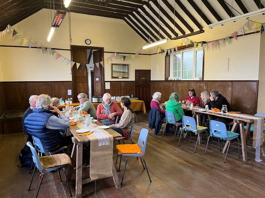 Community members enjoying Lent lunches at Martinhoe Village Hall in North Devon.